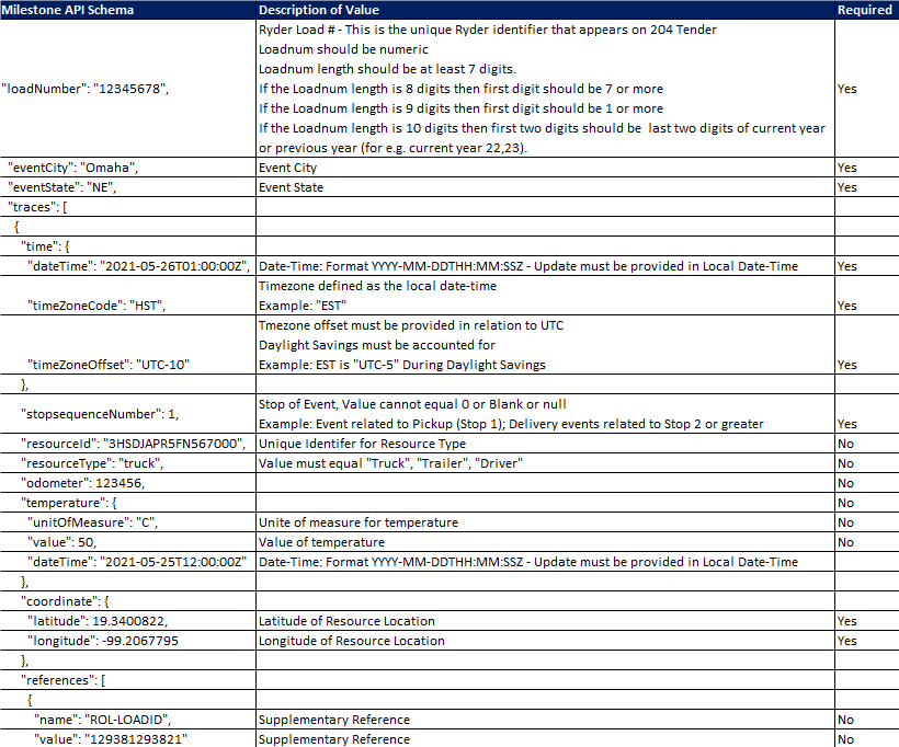 {"loadNumber": "12345678","eventCity": "Omaha","eventState": "NE","traces": [{"time": {"dateTime": "2021-05-26T01:00:00.0000000+00:00","timeZoneCode": "HST","timeZoneOffset": "UTC-10"},"stopsequenceNumber": 1,"resourceId": "3HSDJAPR5FN567000","resourceType": "truck","odometer": 123456,"temperature": {"unitOfMeasure": "C","value": 50,"dateTime": "2021-05-25T12:00:00.0000000+00:00"},"coordinate": {"latitude": 19.3400822,"longitude": -99.2067795},"references": [{"name": "ROL-LOADID","value": "129381293821"}]}]}