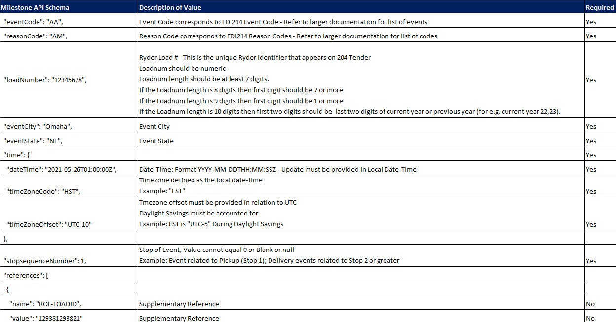 {"eventCode": "A9","reasonCode": "A2","loadNumber": "12345678","eventCity": "Omaha","eventState": "NE","time": {"dateTime": "2021-05-26T01:00:00.0000000+00:00","timeZoneCode": "HST","timeZoneOffset": "UTC-10"},"stopsequenceNumber": 1,"references":[{"name": "ROL-LOADID","value": "129381293821" }]}